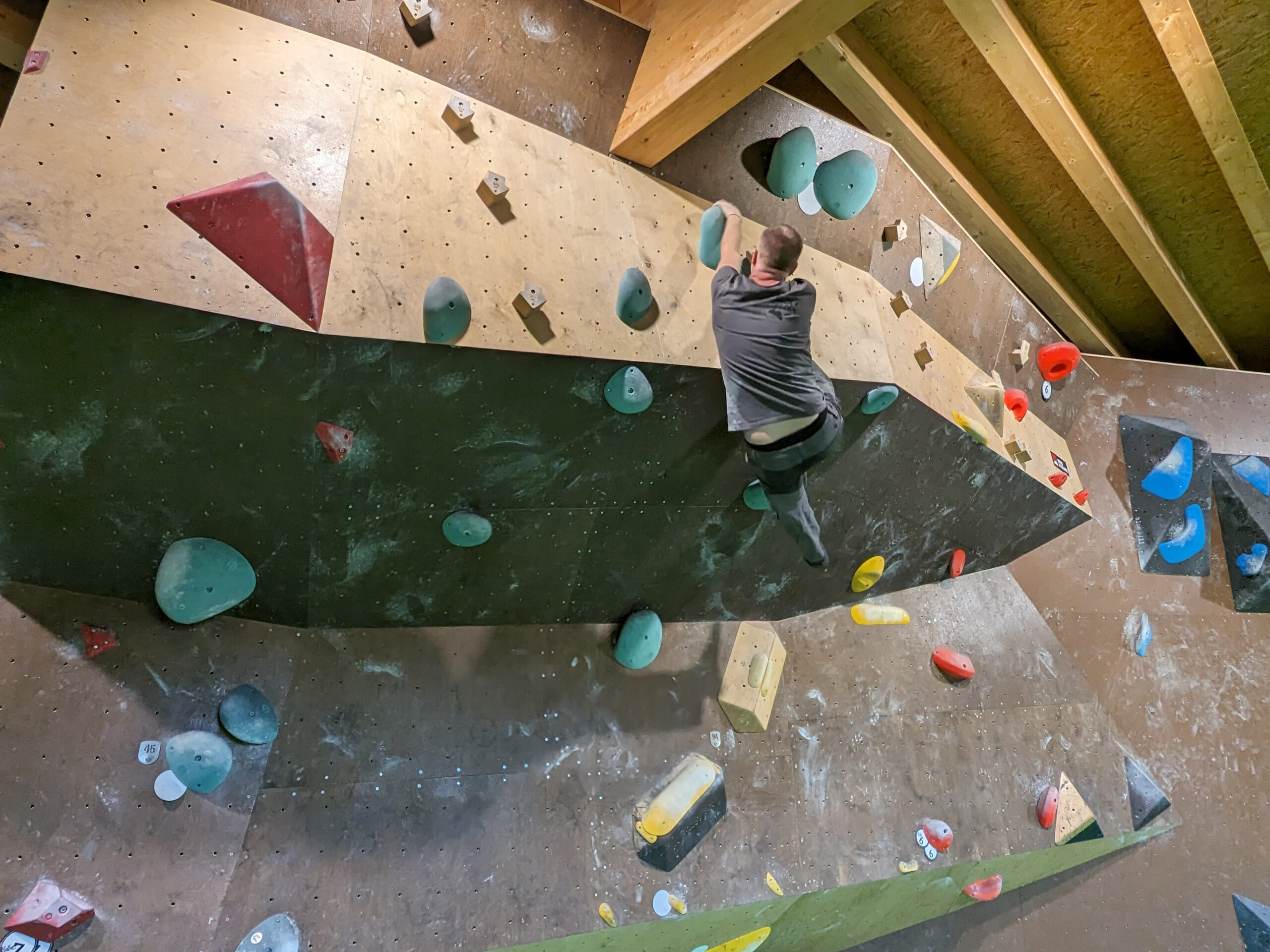 In der Wand hängend, höre ich von unten Tipps und immer wieder ein „nice“. Das hilft, denn manchmal sieht man in der Wand nicht den nächsten Tritt, um das Ziel zu erreichen. Und es spornt an. Genau wie der Erfolg, wenn man eine Route geschafft hat. Zwischendurch tauscht man sich aus: „Wie hast du das dort gelöst?“, fragt Frank Martin. Bereitwillig erklärt Martin: „Mit einem Toehook.“ Und mir erklärt Frank: „Das ist das Haken mit der Fußspitze, um sich besser hochziehen zu können.“ Und Martin ergänzt: „Das hilft dir, Kraft zu sparen.“