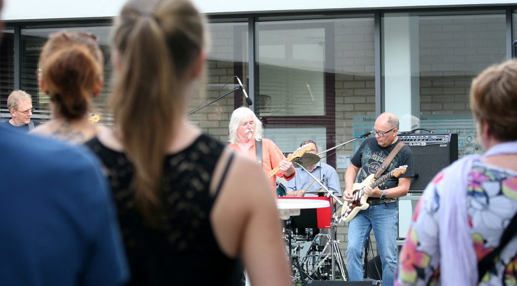 Und auf einmal wurde es laut am RRZE: „Just 4 fun“ rockten am 6. Juni im Innenhof des RRZE und heizten den Zuschauern auch trotz sommerlicher 30 Grad noch ordentlich ein. Rund 70 Gäste waren gekommen, um den vier Vollblut-Musikern zuzuhören, wie sie das Beste von Eric Clapton, Jimi Hendrix, Wishbone Ash und vielen anderen Rock-Klassikern spielten. Die Stimmung beim Feierabend-Konzert war ausgelassen und entspannt, es wurde fleißig mitgewippt und das ein oder andere kühle Bier genossen.