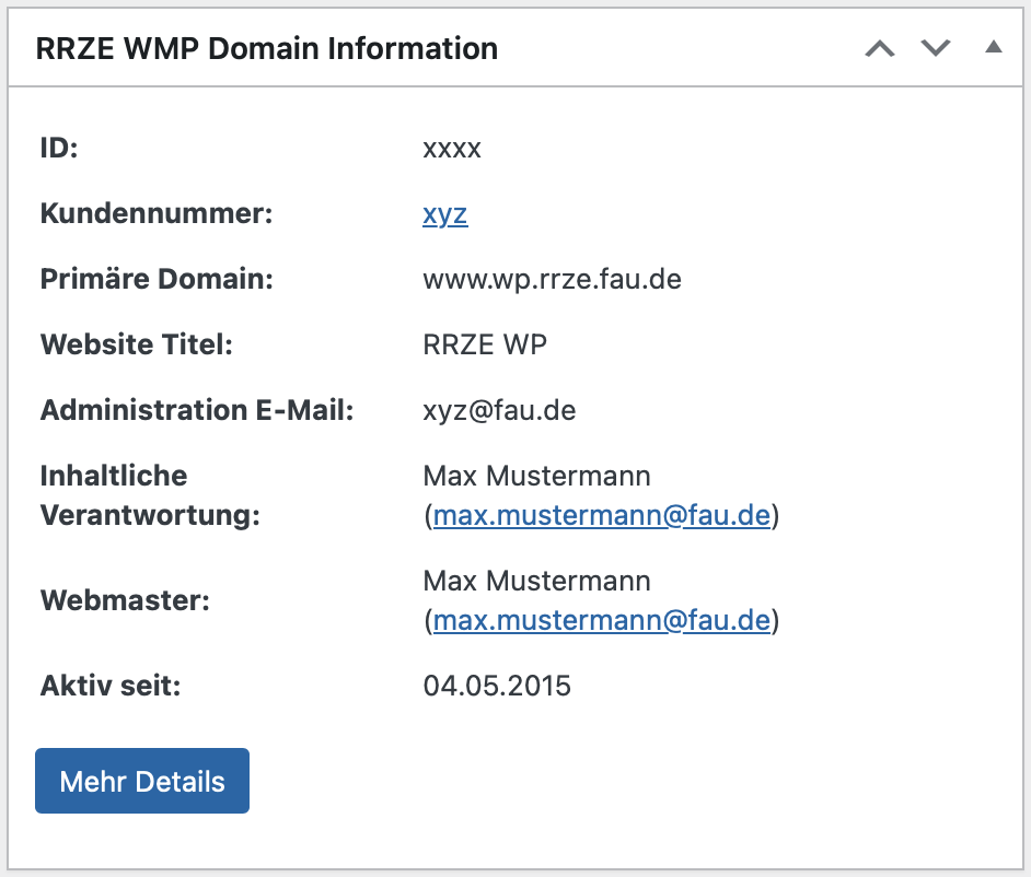 Das Plugin greift über eine Schnittstelle auf das Webmasterportal (WMP) zu, auf dem alle Daten der Webseiten gepflegt werden (Domain, Aliase, Webmaster etc.) und zeigt dann diese Daten im Dashboard in einem Widget an. Sehen können das alle, die im Backend der Website eingeloggt sind.