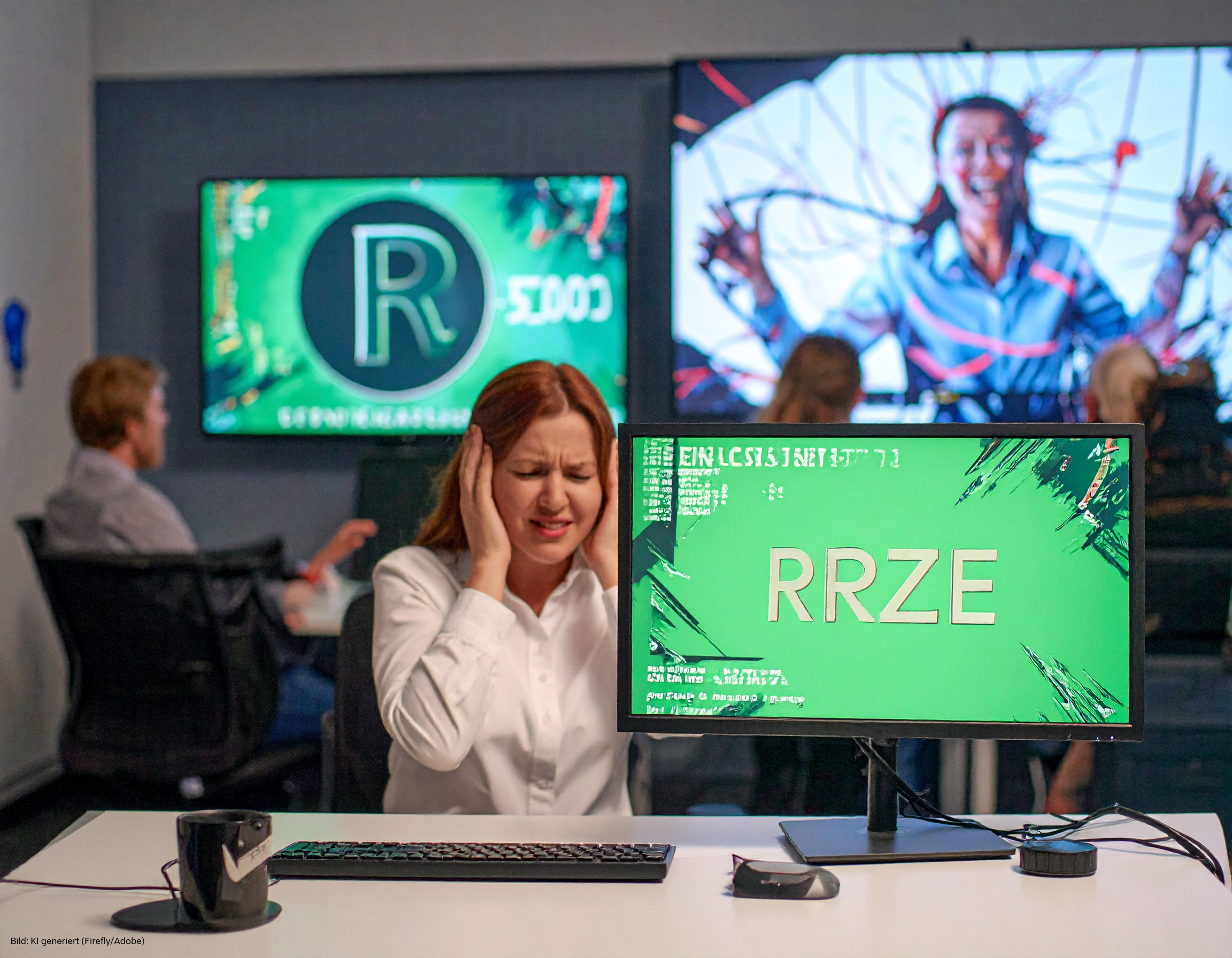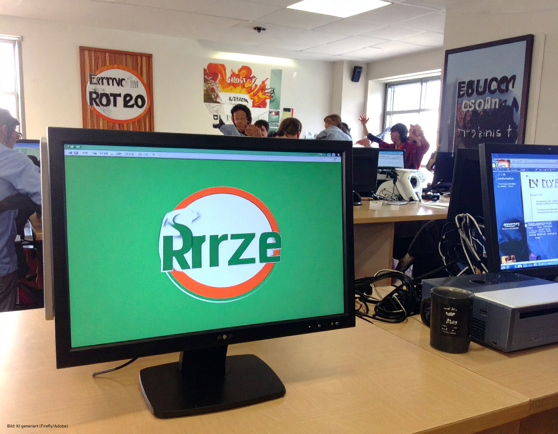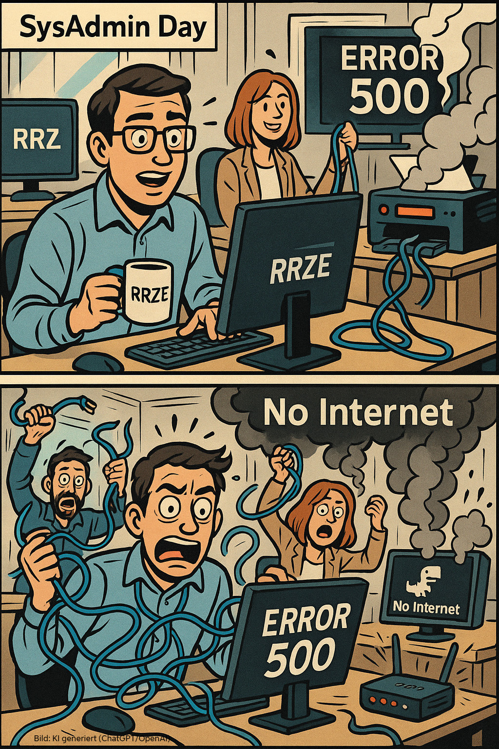 Dezent: Ein „RRZE“-Logo auf einem Monitor oder Tasse. Hier funktionieret die Technik und auf einem zweiten Bild ist dann ein Technik Ausfall/ Störung, chaotisch: Monitore zeigen „Error 500“ oder „No Internet“, Leute fuchteln mit Kabeln, panische Blicke. Vielleicht ein rauchender Drucker oder blinkender Router. Das Ganze in einem Comic Stil.