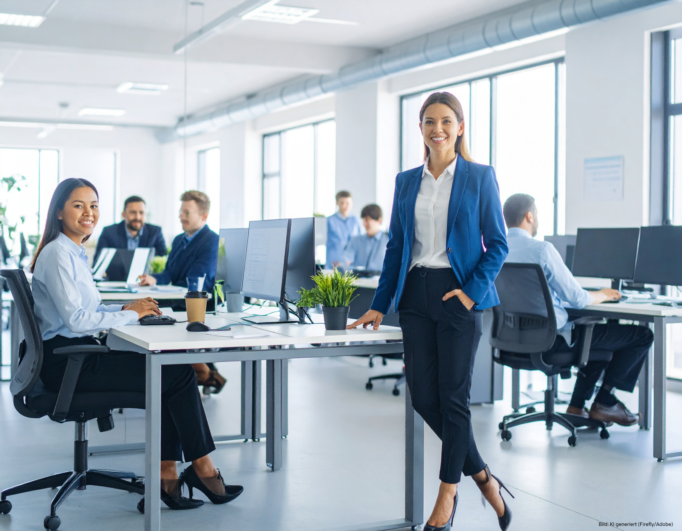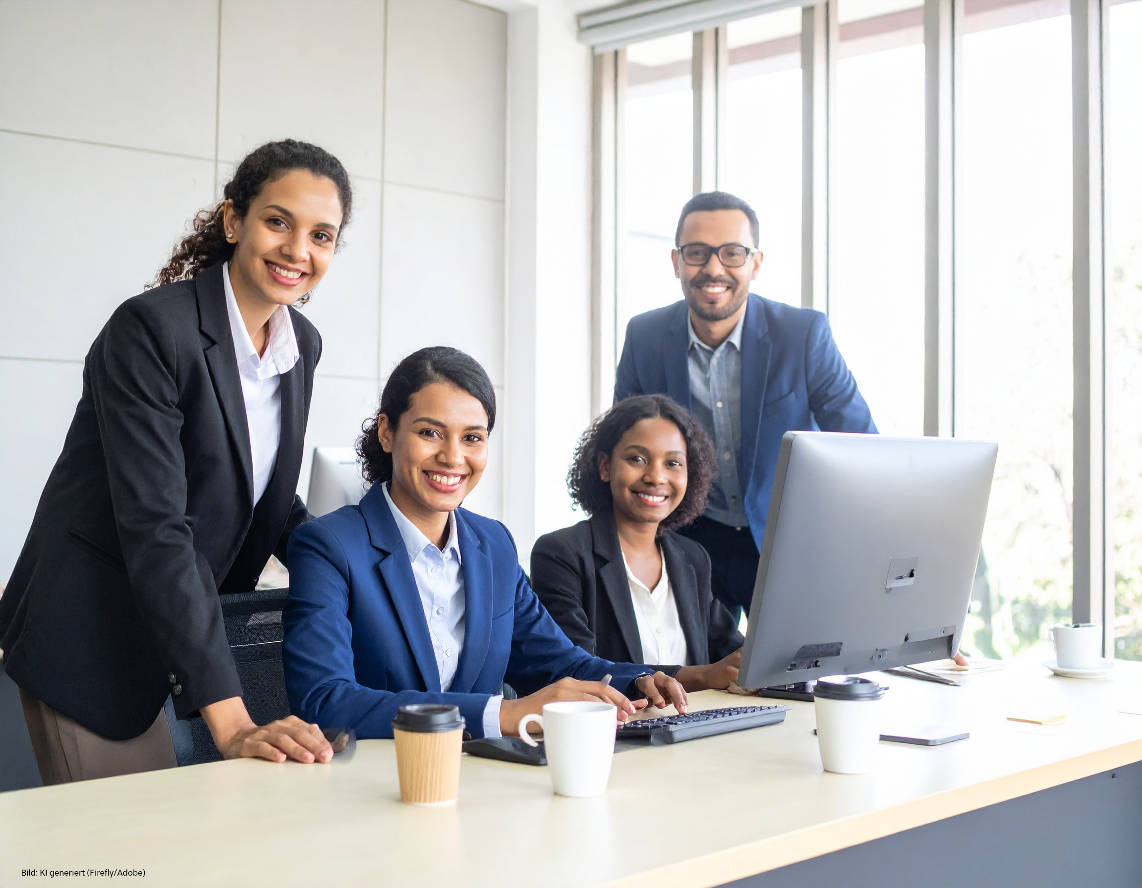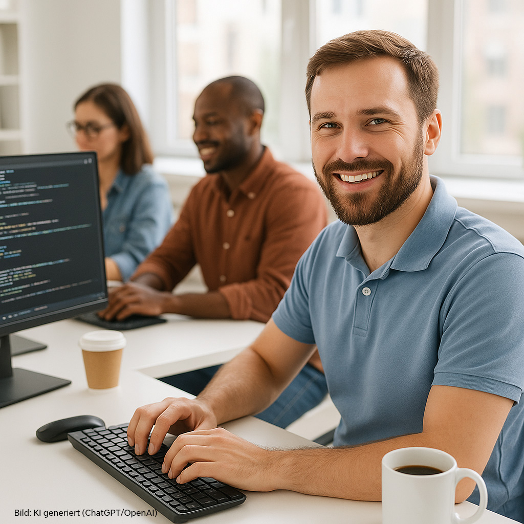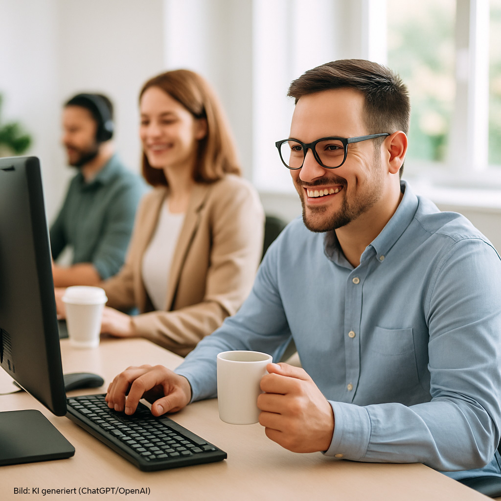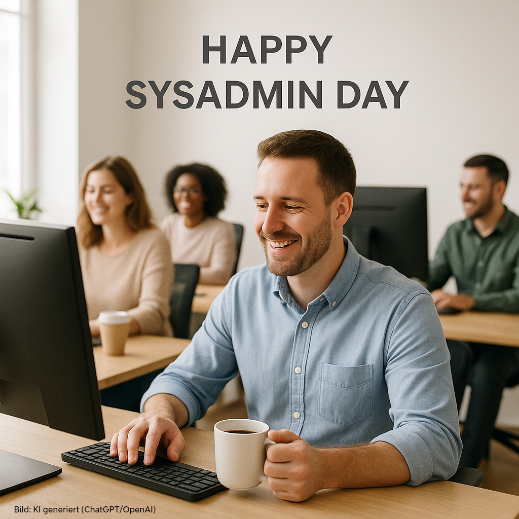 Ich benötige ein Foto für Instagram zum sysAdmin Day: Helle, ruhige Büroszene. Mitarbeiter:innen entspannt am Rechner, Kaffee, alles läuft, lächelnde Gesichter.
