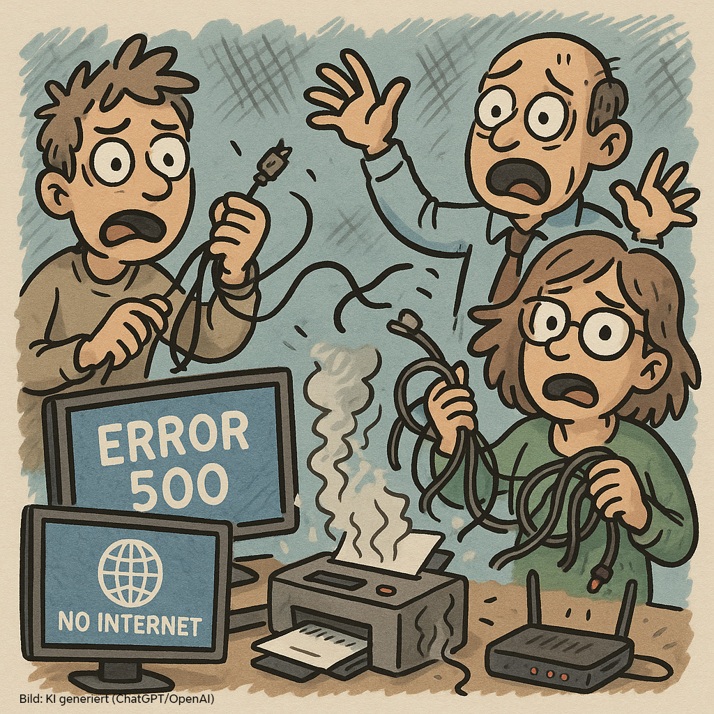 Comicbild Büroszene, die Technik funktioniert nicht, alles chaotisch: Monitore zeigen „Error 500“ oder „No Internet“, Leute fuchteln mit Kabeln, panische Blicke. rauchender Drucker oder blinkender Router.