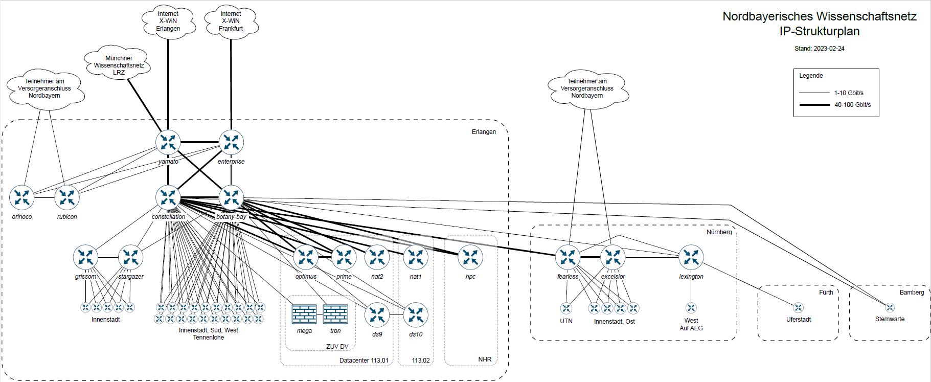Der Backbone des NWN gilt als eines der am weitesten verteilten universitären Datennetze in Deutschland: Speziell bei der FAU liegt dabei die Herausforderung in der historisch bedingten stark verteilten Lage der Universität und ihrer Einrichtungen. Die Netzinfrastruktur erstreckt sich dabei über die Städte Erlangen, Nürnberg, Fürth, Bamberg und Pleinfeld. Im Erlanger und Nürnberger Stadtgebiet sind die Universitätsstandorte in der Regel durch Lichtwellenleiter miteinander verbunden, angemietete Streulagen in der Regel durch professionelle Datenfestverbindungen kommerzieller Provider. Mit dem Internet ist die FAU über einen redundanten Anschluss an das X-WiN des DFN-Vereins auf Basis von 2 x 50-Gbit-Ethernet verbunden.
